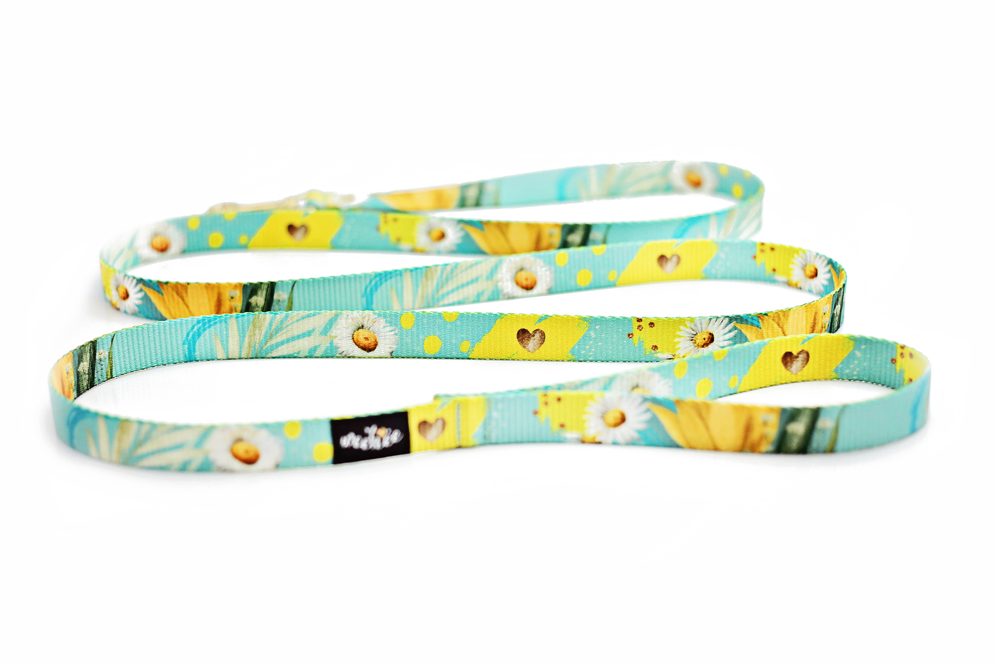 Świt na Twojej dłoni: Turkusowo-miętowa taśma z białymi stokrotkami nawiązuje do etymologii Day’s Eye – oka dnia, które budzi się do życia wraz z Tobą i Twoim psem.